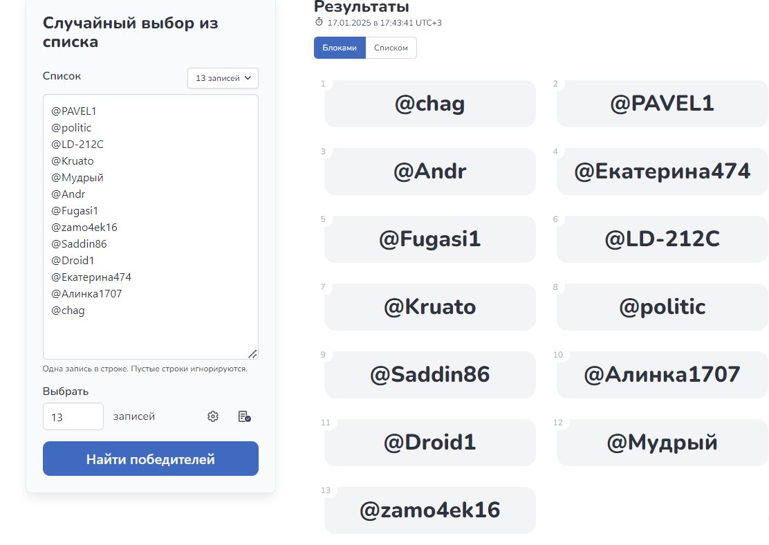 Сейчас рандомом выберем 10 победителей, которые получат промокоды, остальные получат по 150 форумных кредита, итоги через несколько минут…