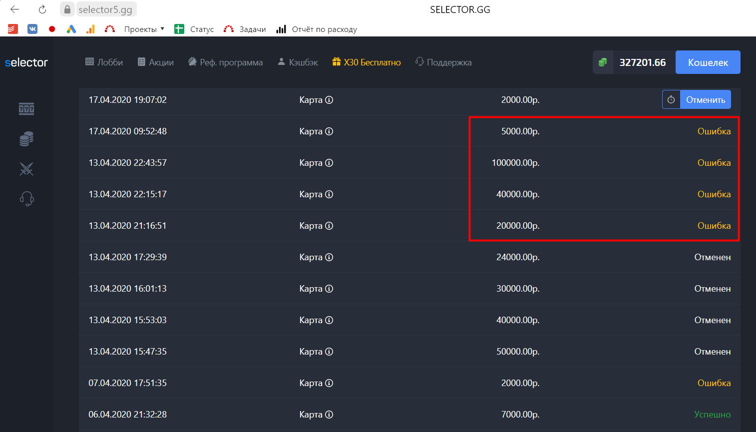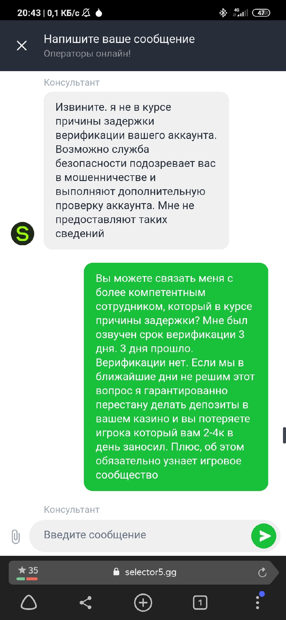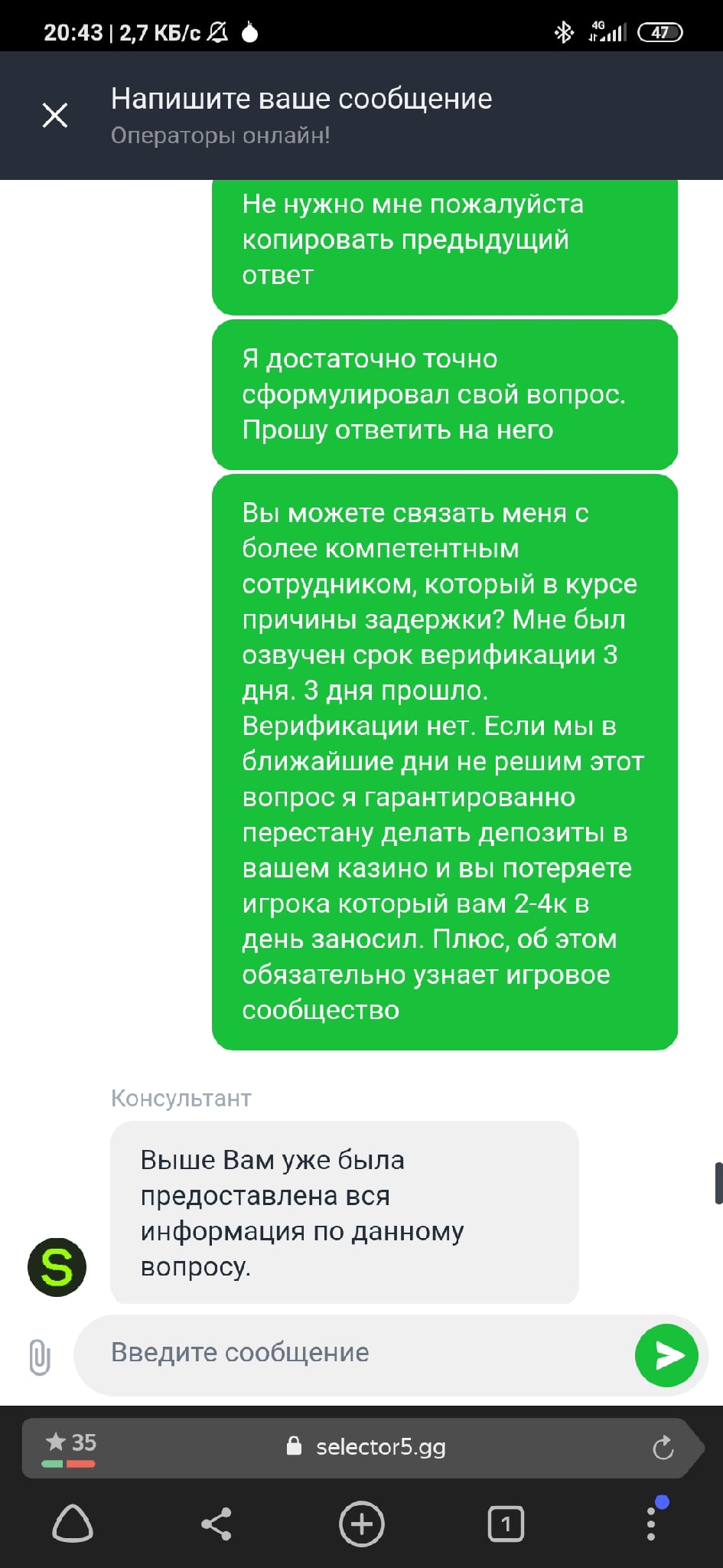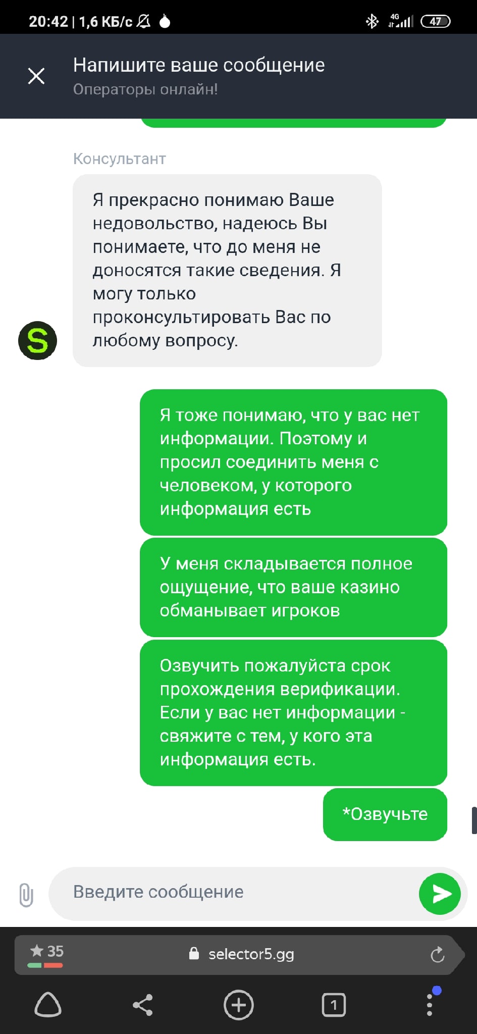 Играл в казино selector несколько месяцев. Никогда не было проблем с выводами, спокойно выплачивали 7-10к.