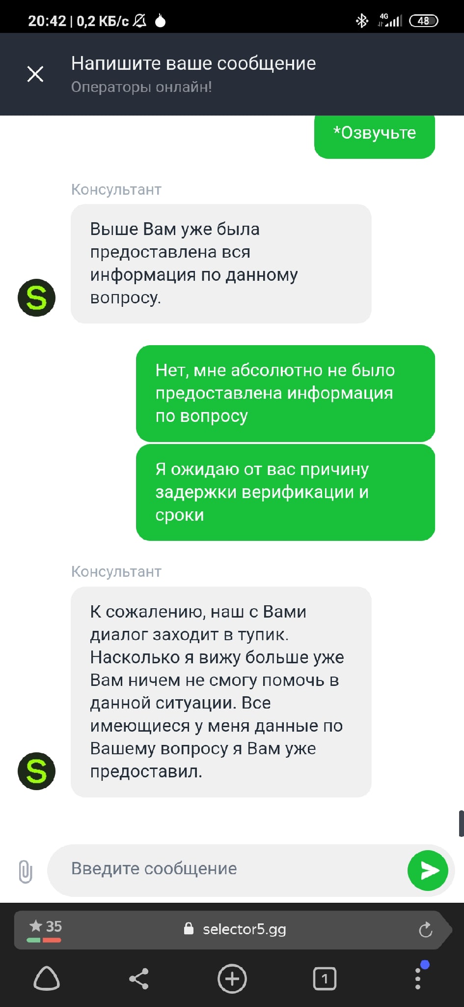 Очередной платёж на 160к (тремя частями по 100, 40 и 20к) был отменён. На вопрос в чате оператор ответил, что нужно пройти верификацию, которая занимает не более 3-х дней. Отправил документы (паспорт, фотографии карт). И всё - тишина. После того, как 3 дня прошло - писал операторам в чат, получал копипасту в ответ - статус изменится в личном кабинете, когда верификация будет пройдена. Когда это произойдёт - они не знают и никакой информацией не владеют. На все вопросы отвечают стандартными отписками или копипастят предыдущие ответы. Никакой конкретики. Попробовал 5000 поставить на вывод - тоже отмена.