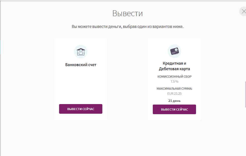 Для вывода также необходимо выбрать счет, с которого вы хотите списать средства, после чего система проинформирует вас, в какой валюте будет произведена транзакция и покажет процент комиссии.
