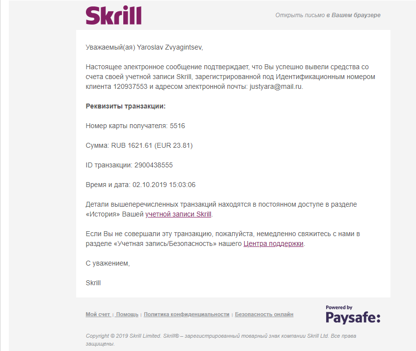• С 15 января 2020 г. комиссионный сбор за транзакции, совершенные с помощью Услуги Skrill по переводу денег внутри страны, составляет 2%.