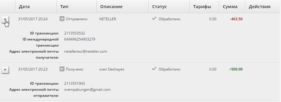 23:24, 31 05 2017 CEST EUR 463.50 было переведено с Вашего счета Skrill на имя NETELLER ([email protected]).