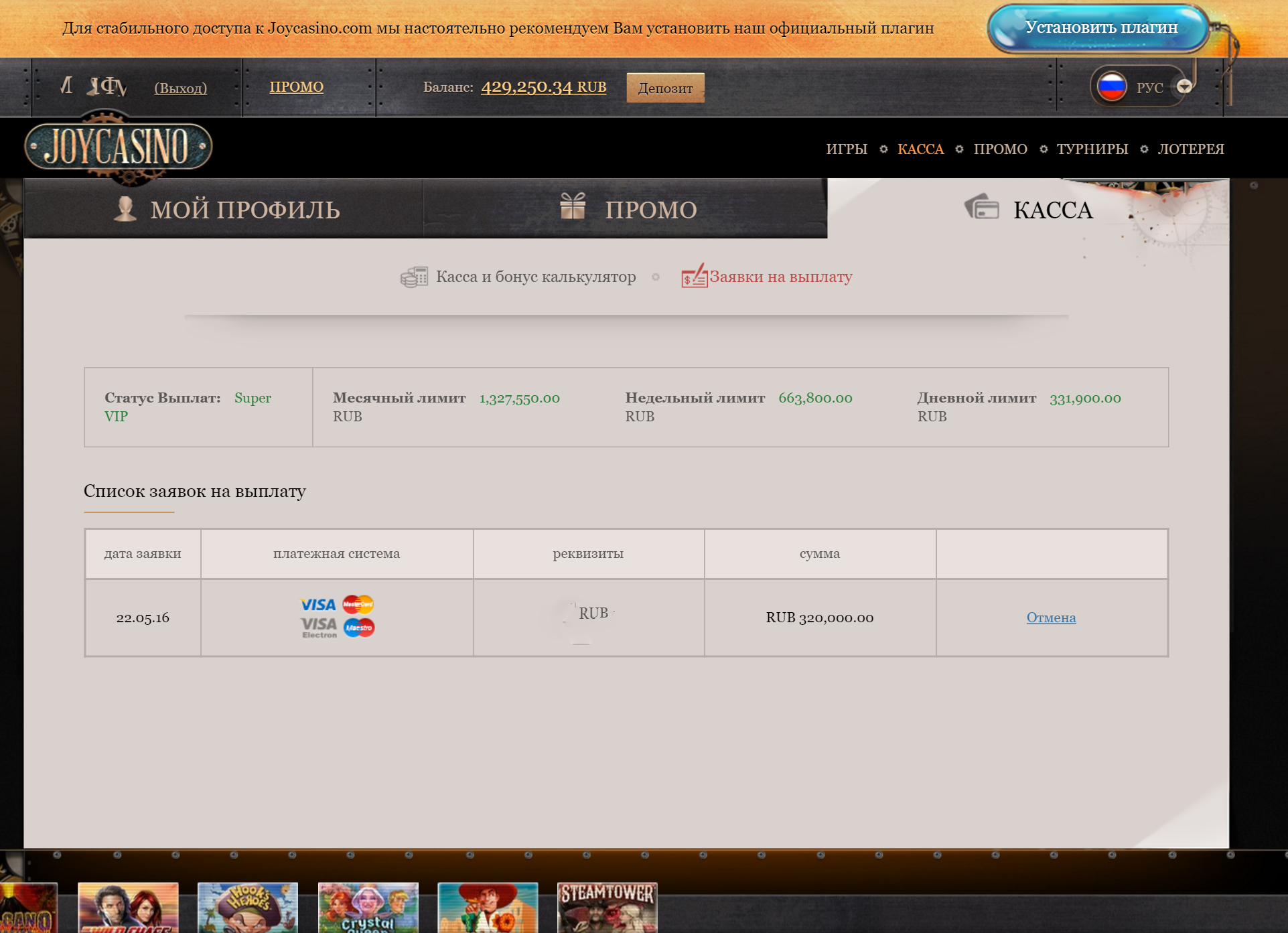 Начал играть в четверг, с прерываемыми закончил в понедельник. Общий деп был 35 000 руб. Надо отметить, что в апреле проиграл около 800 000 руб. Сейчас почти все отдал. Играл на разных автоматах, я в них особо не разбираюсь. В субботу играл часов 5 непрерывно. Выиграл не на одном, играл на разных уже и не помню толком. Вот помню игра с алладином, где джин с лампы выходит, по ставке 2000 руб. дал три лампы и выдал 120 000 руб. Дальше больших таких выигрышей не было, так по 30 000, 60 000 руб. Было, что с 200 000 опускал до 7 0 000 руб., как не залип до конца не знаю, теперь сам себе удивляюсь. Во общим повезло немного. Да первые 320 000 руб. уже вывели, сейчас стоит 320 000 на вывод.