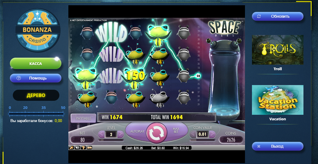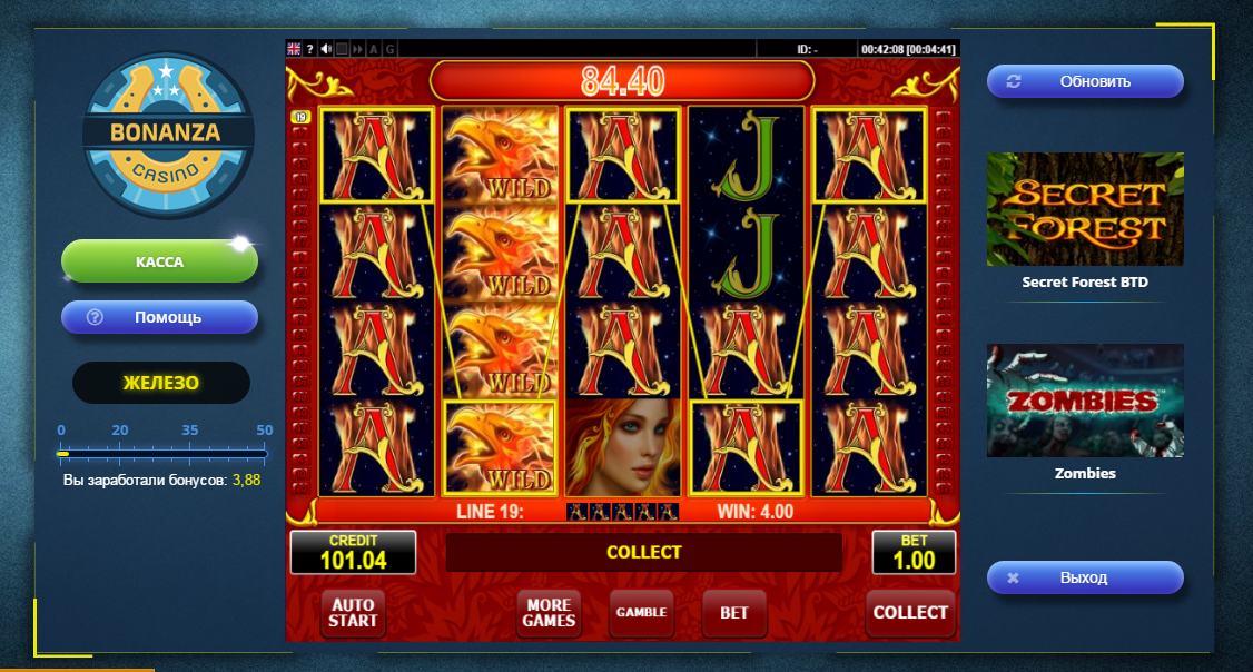 первый раз поймал 5 вайлдов,четвертый упал на 11 спине и лег по линии, пятый упал криво не по линии на последнем 12 спине,заскринить не успел ну и на этом спасибо :) минимальная ставка = минизаносик Х 380.(первая бонуска за сессию)