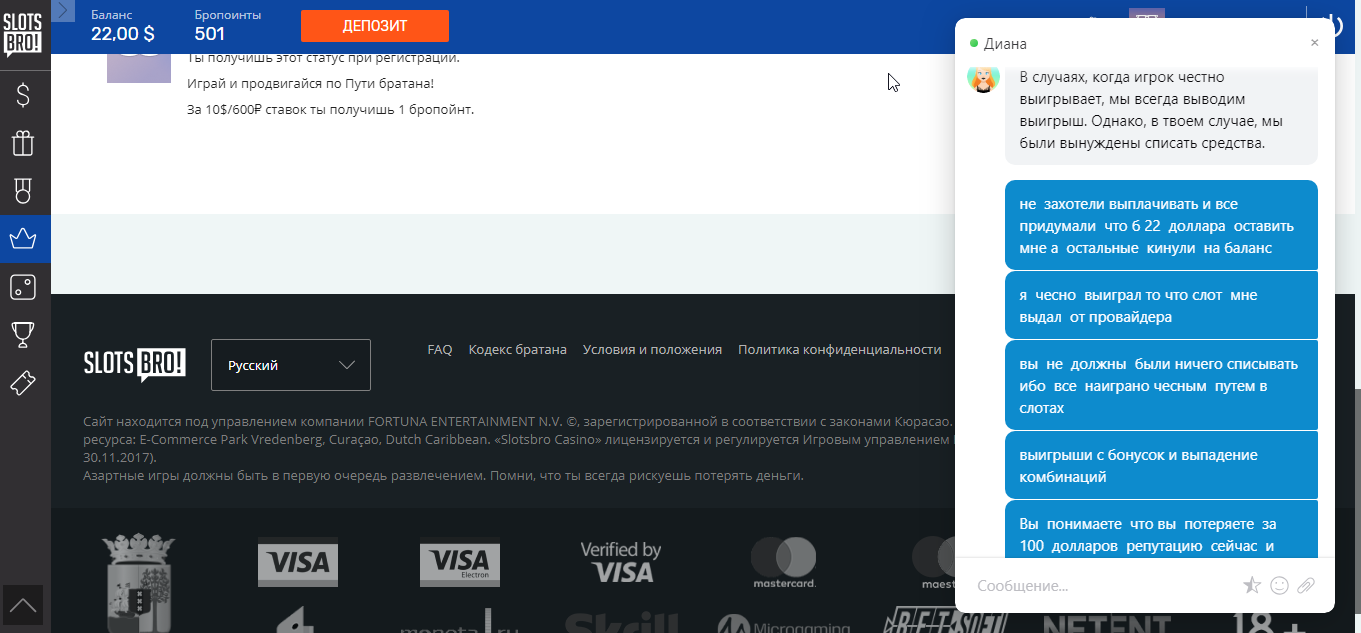В прошлую пятницу я увидел хорошую акцию которая пришла мне на почту с фриспинами которыз было 200 и решился сделать у них минимальный депозит под акцию фриспины и начал крутить их слоты поднялся с фриспинов а их было 200 до 80 долларов с копейками вместе со своим балансом я начал отмывку вагера в протцесе игры я поднимался примерно до 400 долларов но и в конечном итоге отмыл их до 132 долларов - мне в чате сказали что я благополучно после прохождения верифиации и прочего смогу вывести все со счета и что на карту это занимает в порядке 1- 2 дня обработка ! Верификацию я прошеь у них в понедельник быстро но приглядевшись я заметил что уних там в казино вообще никто не играет совсем и они чтото тянут мне с выплатой говорят мол фин отдел задерживают и уверяли что бы не волновался все будет выплачено! Я ждал ждал и заподозрил уже чтото неладное ибо прошел с пятницы 4 рабочий день - обратился им в чат в очередной день - они сказали что мне фин отдел ответит на почту и вот что получилось они списали по своему беспредельному усмотрению 110 долларов упираясь на глюк в слоте которого воообще небыло в пользу казино и забрали весь выигрыш оставив мне на балансе 22 бакса и я кобы в тешенье дав мне 500 бро поинтов которых можно только в опу себе засунуть !! Вообщем люди Уверяю вас и остерегаю не стоит играть в этой беспредельной шараге могут конфесковать у вас в любой момент выигрыш и ничего им не докажешь- Скриншоты тому доказательство ! Убедительно по человечески Прошу администрацию форума добавить данную организацию Братанов в черный список что бы никто с наших форумчан не попался на их удочку!!