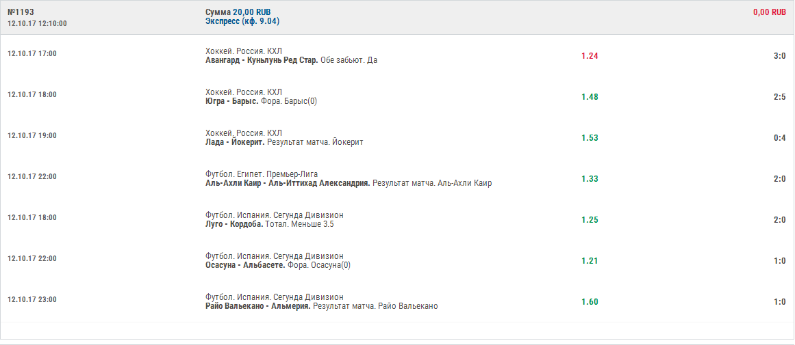 нормуль, правда кофики маленькие, я всегда около 2 беру. Малых кофов много набирать надо около 10 и вероятность прохода всех нереально мала, я раньше так делал, лучше я возьму два события с кофами 2 и будет общий 4, чем 10 событий с кофами 1,2. Был свидетелем ставки, паренк ставил на Барселону 1х, что она либо выиграет либо в ничью, он поставил 5000 гривен, чтобы наварить 400, кофик был что то там 1,01,,, ну не помню кароче очень маленький, он как бы думал что верняк верняковый, а барса все 90 минут сливала 01 и на 93 сравняла. Чувака чуть паралич не разбил за эти 90 минут, так как этот малолетка все деньги поставил, кредит походу взял. Так вот по опыту маленькие кофы не так уж часто и играют и я пришл к выводу что лучше работать со средними кофами и средними либо большими суммами. Например 2 кофа по 2 это 4 и кинуть на них полтишок 50.