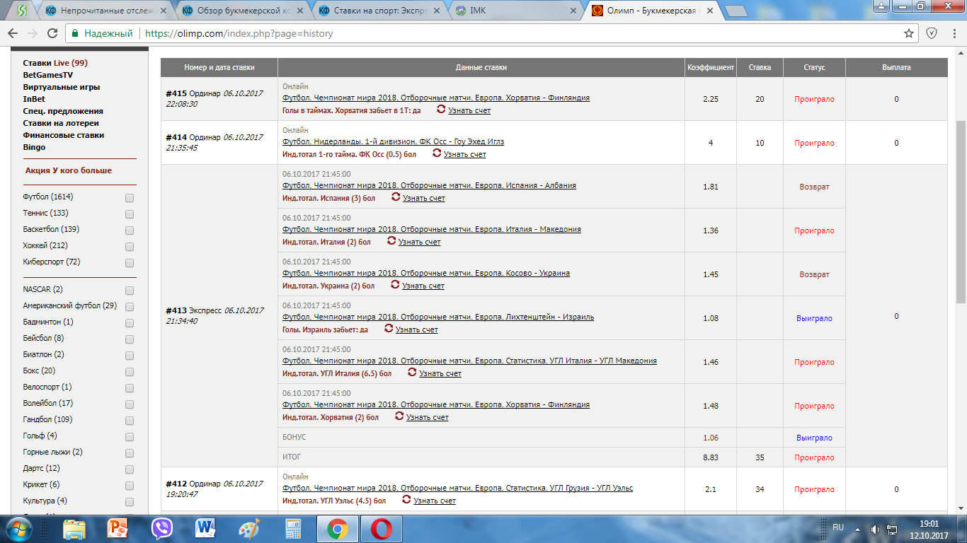 Ставки на спорт: Экспресс , Ординар , Лайв / Ставки на футбол и другие виды спорта.