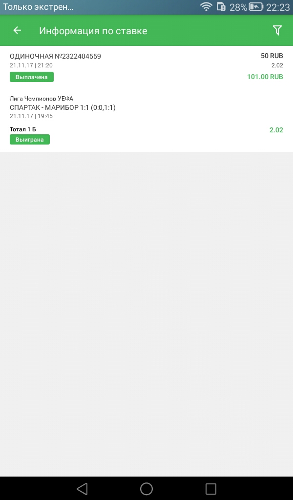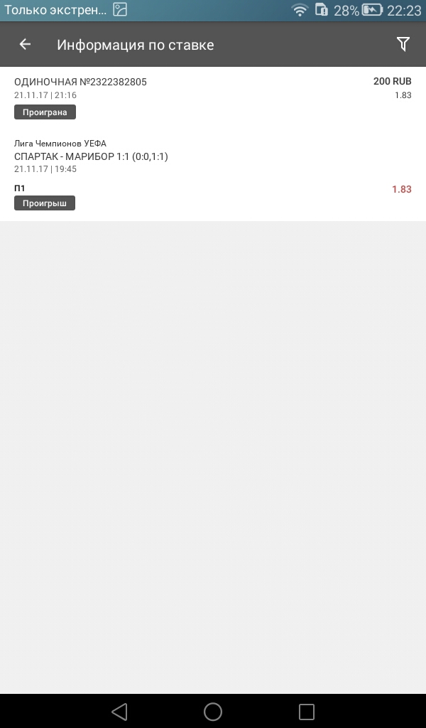 Блин,Спартак-это точно обезьяна с гранатой...)))хорошо не весь банк поставил.а ведь перед матчем готов был весь воткнуть за 1.25.зашёл на 61-й минуте.ещё на тотале чуть отбил...Screenshot_2017-11-21-22-23-03.jpegScreenshot_2017-11-21-22-23-14.jpeg