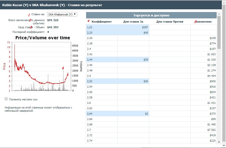 № 6 на графике видно суммы поставленных денег на выбранный исход.В данном примере видно ,что кто то поставил 2500 долларов на хабаровск.