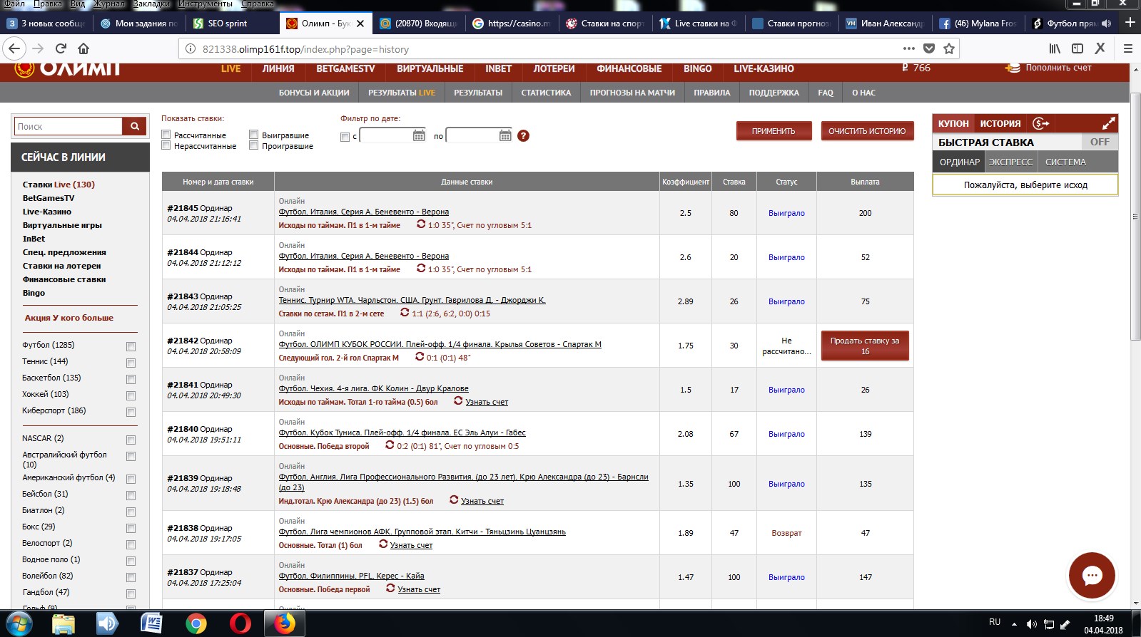 Ставки на спорт: Экспресс , Ординар , Лайв / Ставки на футбол и другие виды спорта.