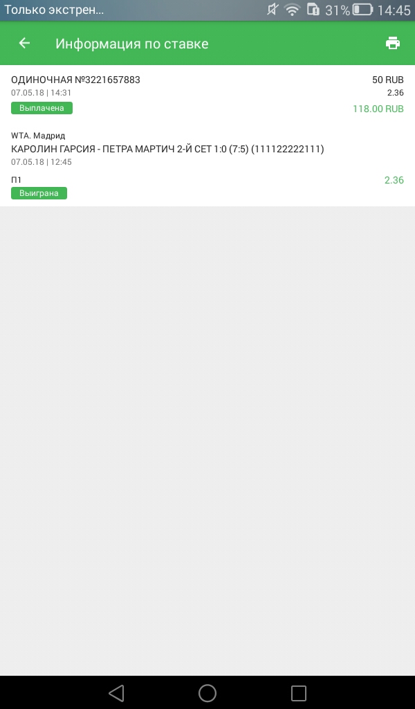 наковырял в инете полтинник,и решил в наперстки поиграть..))ставлю на сет при счёте 4-5 на подаче Гарсия.и тут 0-30.перематерился,конечно,но,как оказалось зря.гейм она взяла,ну а потом и дожала.может,полоса кончилась и пора уже норм депать?)Screenshot_2018-05-07-14-45-25.jpeg