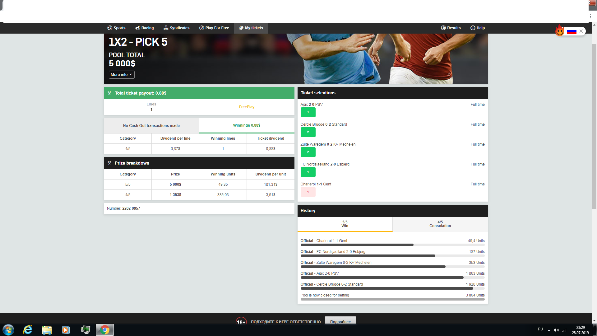 еще и в бетфейре при 4 из 5 побед давали, 9 евро, нужно было забирать, но я решил 5-ый матч подождать)) в итоге проигрыш, и дало 80 центов мдаааааааа