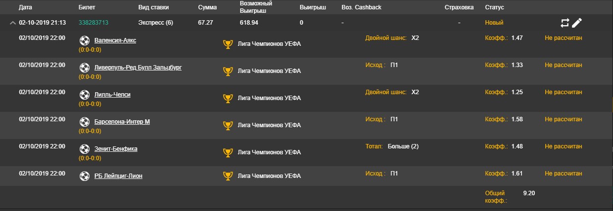 и лион забил...) но у меня там на ТБ 2.5 и победа лейпцига этого..аякс и ливерпуль как раз и забили голы, результативно началось.. ливер еще может сразу положить.