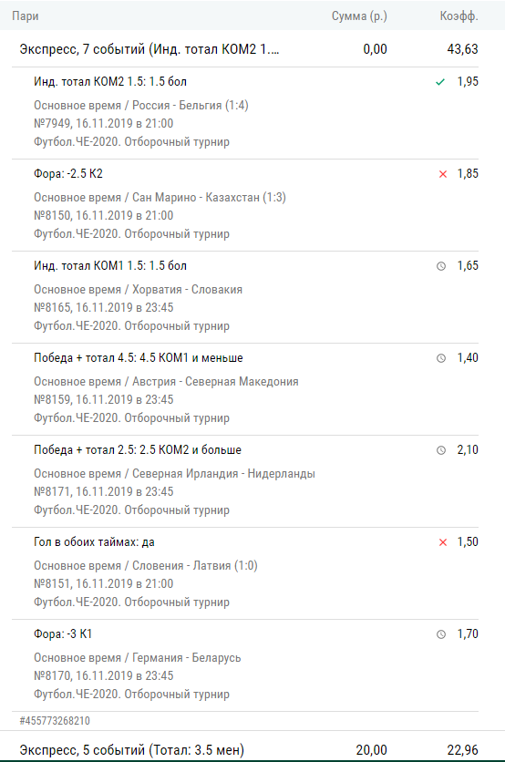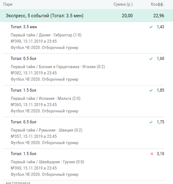 Да там англосаксы поиздевались над косачами с их индейскими контрами под свист трибун.... Я смотрел угаралНаходясь в долгах (для меня не приятных) , взял ещё у брата.. И нет бы рискнуть, поставил только половину суммы на итб 1.5 Бельгии.. Ну ещё в лайве за 20 секунд до года не успел поставить что слудющий гол бельгия, но зато успел на 4й гол Бельгии)