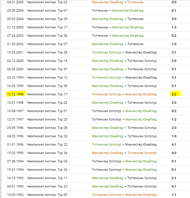 Так я вроде как тоже на это клюнула по началу, а Тоттенхэм с МЮ в ничью со счетом 2:2 всего 1 раз сыграли, 22 года назад