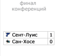 Как я и предполагал, Акулы (Сан- Хосе) проглотили и не подавились весь оркестр Блюзменов ( Сент-Луис)со счётом 5 : 2 , и теперь затаились в финале чемпионата, ожидая очередную "жертву" .....:)