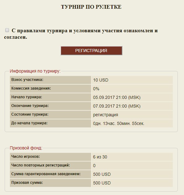 Правила европейской рулетки. И на все про все в течении 2-суток, но играешь когда удобно..впрочем, если места будут, можешь хоть за 5 минут до окончания зарегаться. Если все проиграл дают на все про все 2 повторные регистрации .Закрываешь свой стол.За 10 баксов регишься снова. Главное отыгрывать ничего не надо,если в призах.