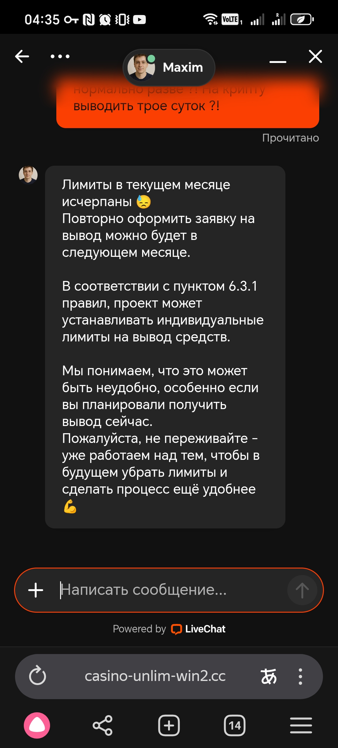 Установили лимиты на вывод по непонятным причинам , зарегистрирован там года 2-3 играл выводил проблем не было раньше , сейчас при выводе столкнулся с такой проблемой , вывели часть и остальное лимиты , до следующего месяца ждать две недели и неизвестно какие лимиты установят в следующем месяце.