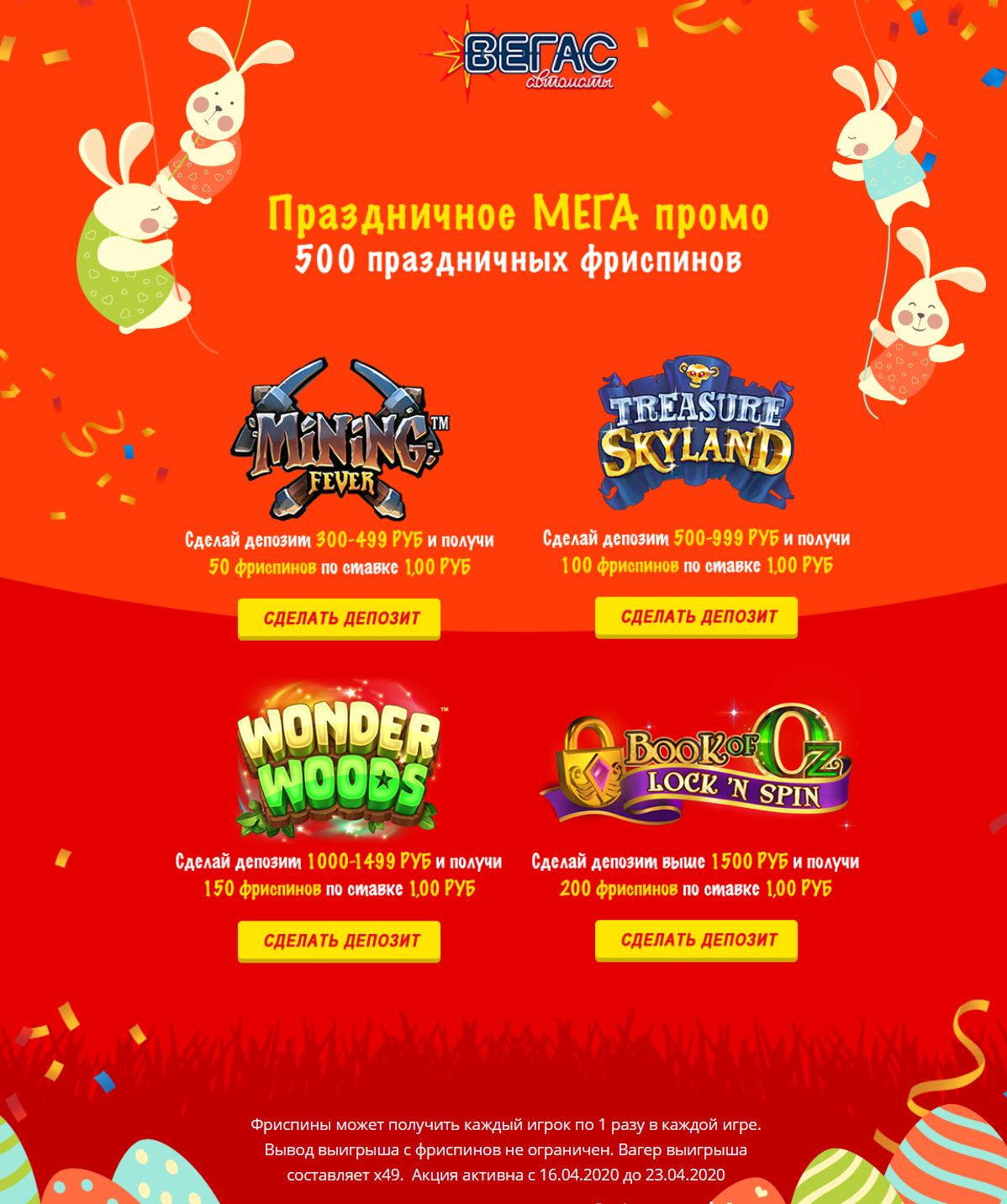 Фри-спины может получить каждый игрок по 1 разу в каждой игре. Вывод выигрыша с фри-спинов не ограничен. Вагер составляет х49 во всех слотах.