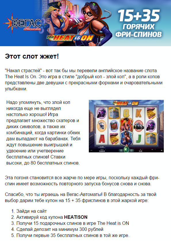 А мне сегодня позвонили и сказали, что меня ждут 30 бесплатных вращений с повышенными ставками в игре Pollen Party и 100 бесплатных спинов в игре Lost Vegas во всех трех версиях... покрутил я эти спины, получилось набрать 60 рублей и слил их обратно, неудачно получилось... может еще чего-нибудь подарят, депозит пока не хочу делать )