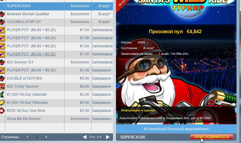 Ежедневно в казино Вегас Palms проходят более 30 турниров. Здесь можно поучаствовать как в месячных или недельных турнирах, так и в ежедневных или почасовых. Стоимость входа в турнир варьируется от 0.20 до 10 $. Призовые фонды турниров соответственно разнообразны и щедры. А для тех, кто предпочитает попробовать себя в турнирах бесплатно, есть большой выбор фрироллов, где вход бесплатный, а выигрыши реальны.