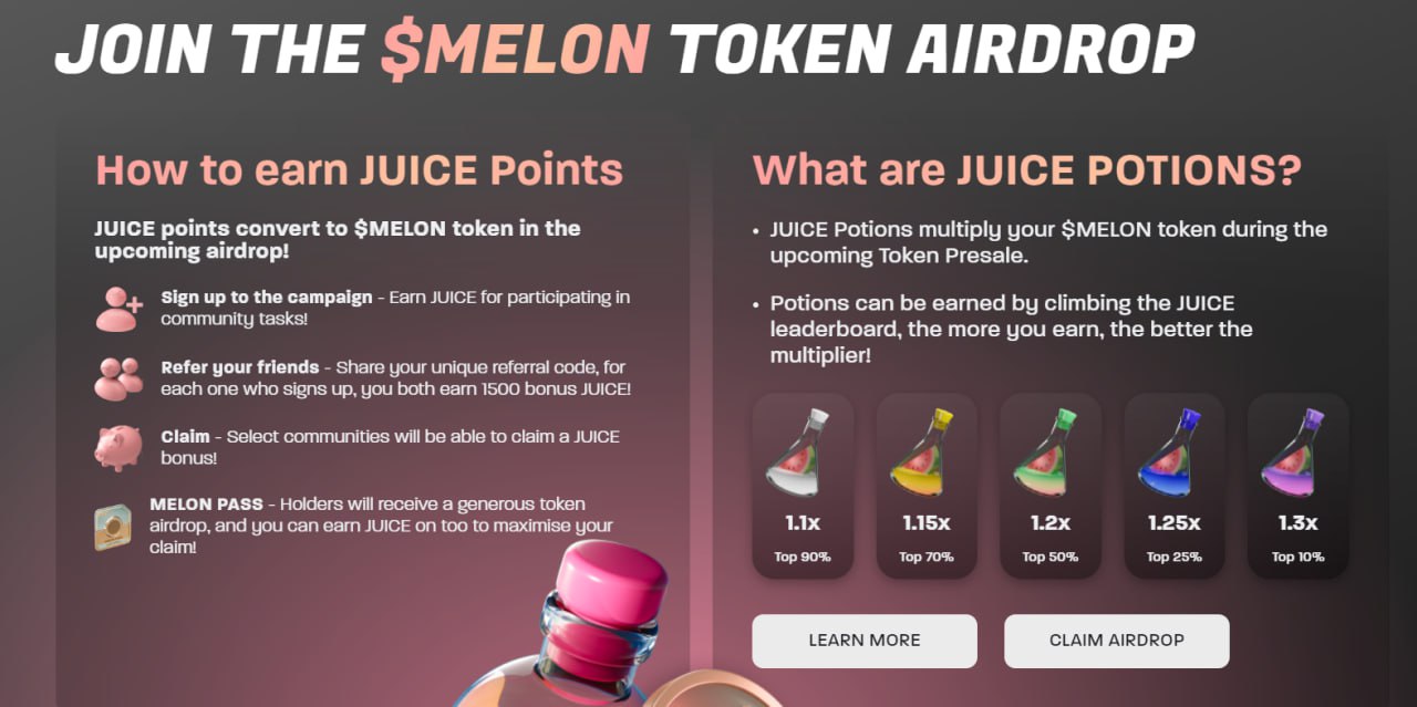 Наши поинты JUICE буду конвертироваться 1 токен $MELON = 100 поинтов $JUICE. Индусы думают, что цена токена 0,30$/0,50$. Также там будет линейный разлок 40% сразу, дальше линейный разлок 2 месяца. В общем выглядит довольно неплохо.