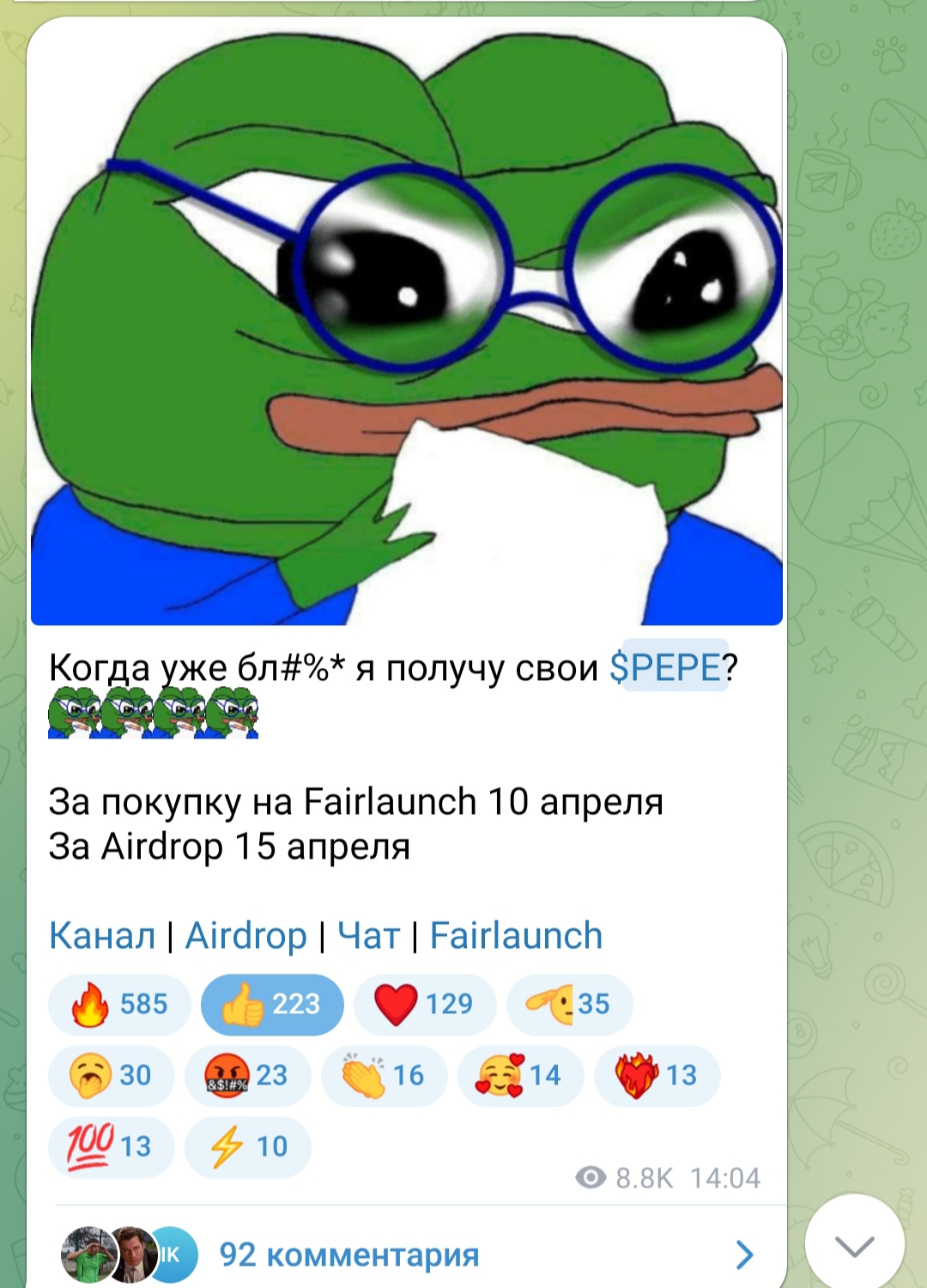 Pepe теперь торгуется 200 монет ~ 1.33$, плюс в боте можно их удвоить, сделав пост в твиттере. Кто абузит в принципе не плохо может выйти