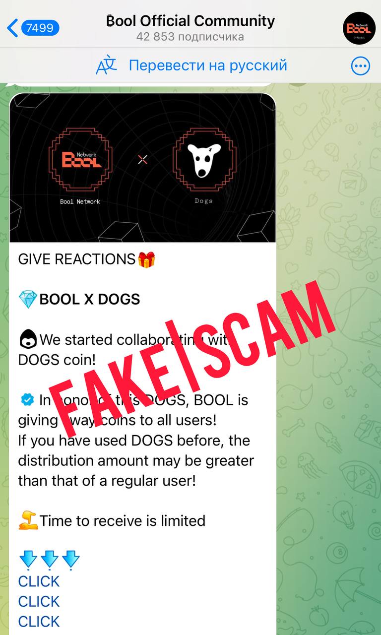 Связались с командой Bool Network, они подтвердили, что никакой коллабы с DOGS у них нет и что данный канал не является их официальной страницей.