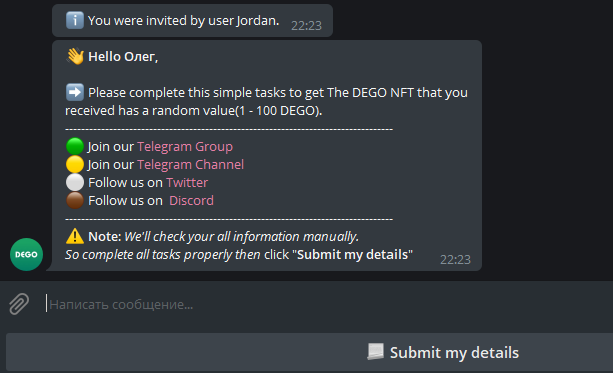 Жмём "Submit my details" и подписываемся на телеграм каналы
