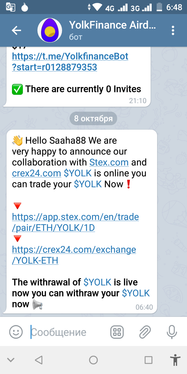 👋 Привет, Saaha88. Мы очень рады объявить о нашем сотрудничестве со Stex.com и crex24.com. $ YOLK в сети, вы можете обменять свои $ YOLK прямо сейчас❗