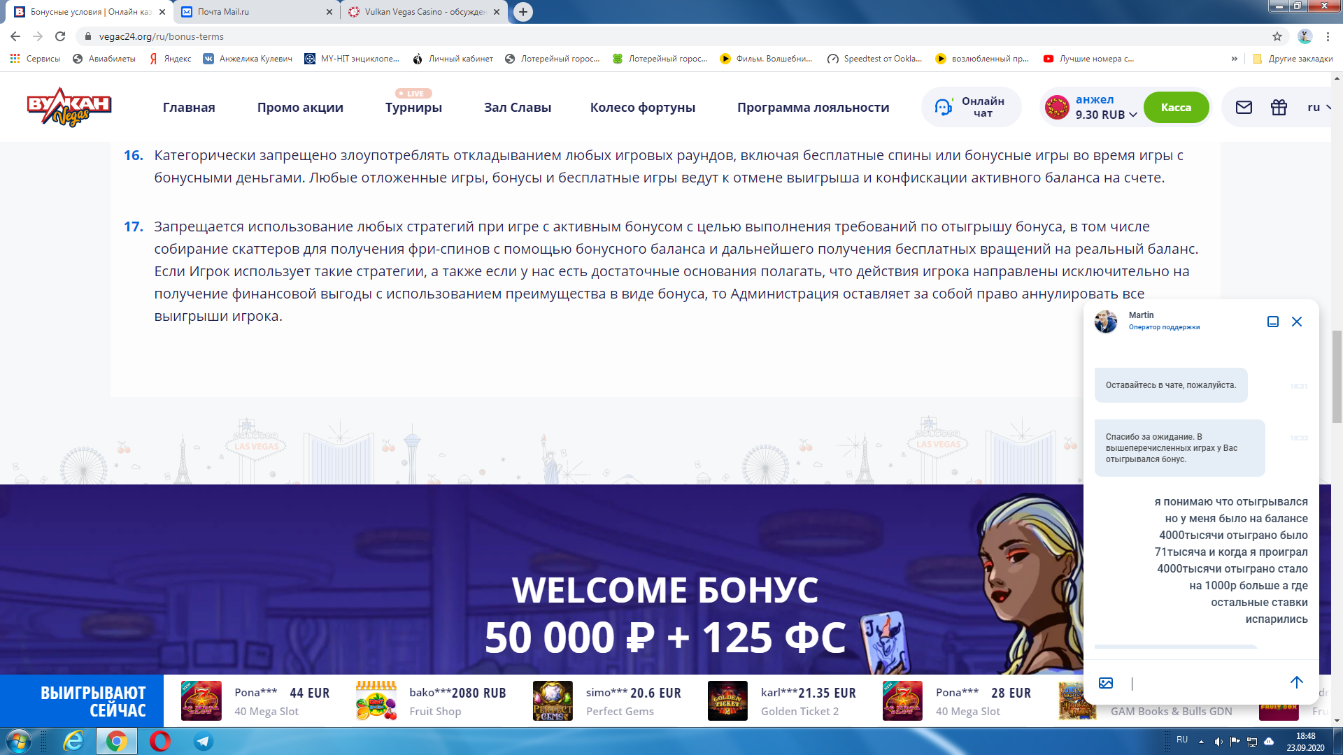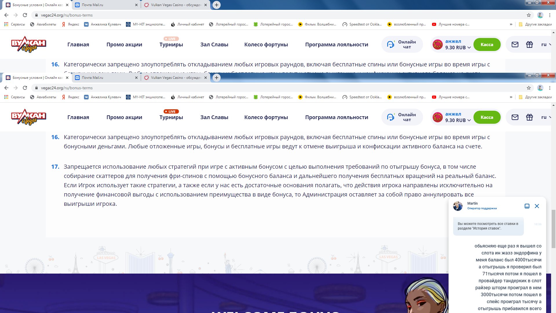 Привет.Попробую пригласить представителя на форум. оставь почту от вегаса.короче играл в слот ин джазз от эндорфины вышел с него баланс был 4000т рублей посмотрел отыгрышь был 71200с копейками потом пошел в тандеркик райзер шторм катал по 25 р минут сорок он и выиграть нет нет давал там руб по 500 по 600 ну короче всрал в него во концовке 3000тысячи потом пошел всадил последний рубас в спейс дай думаю зайду гляну отыгрышь и опа отыгрышь та всего 72400)тут я и обомлел сидел весь день херачил как папо карло палец вместе с мышкой стер до костей а отыграл всего 72000 пишу в чат оператор сам говорит с ваших последних игр указанных шли ставки в отыгрышь я пишу какого хрена тогда в отыгрышь зачислилось всего тысяча с копейками хотя должно было еще как миниму тысяч семь)))и тут они тишину поймали и не отвечают модеры дерните представа на форум будем разбираться с этими умниками с топ бонусами)