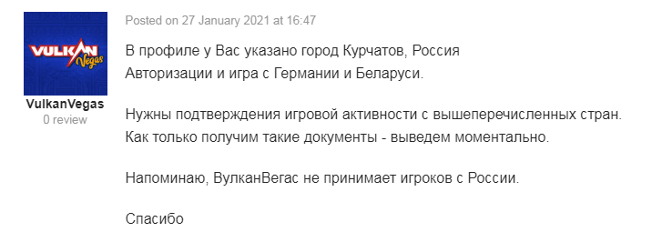 Но представитель от казино не говорит о новых игроках, он говорит, что игрокам из РФ запрещено играть VulkanVegas