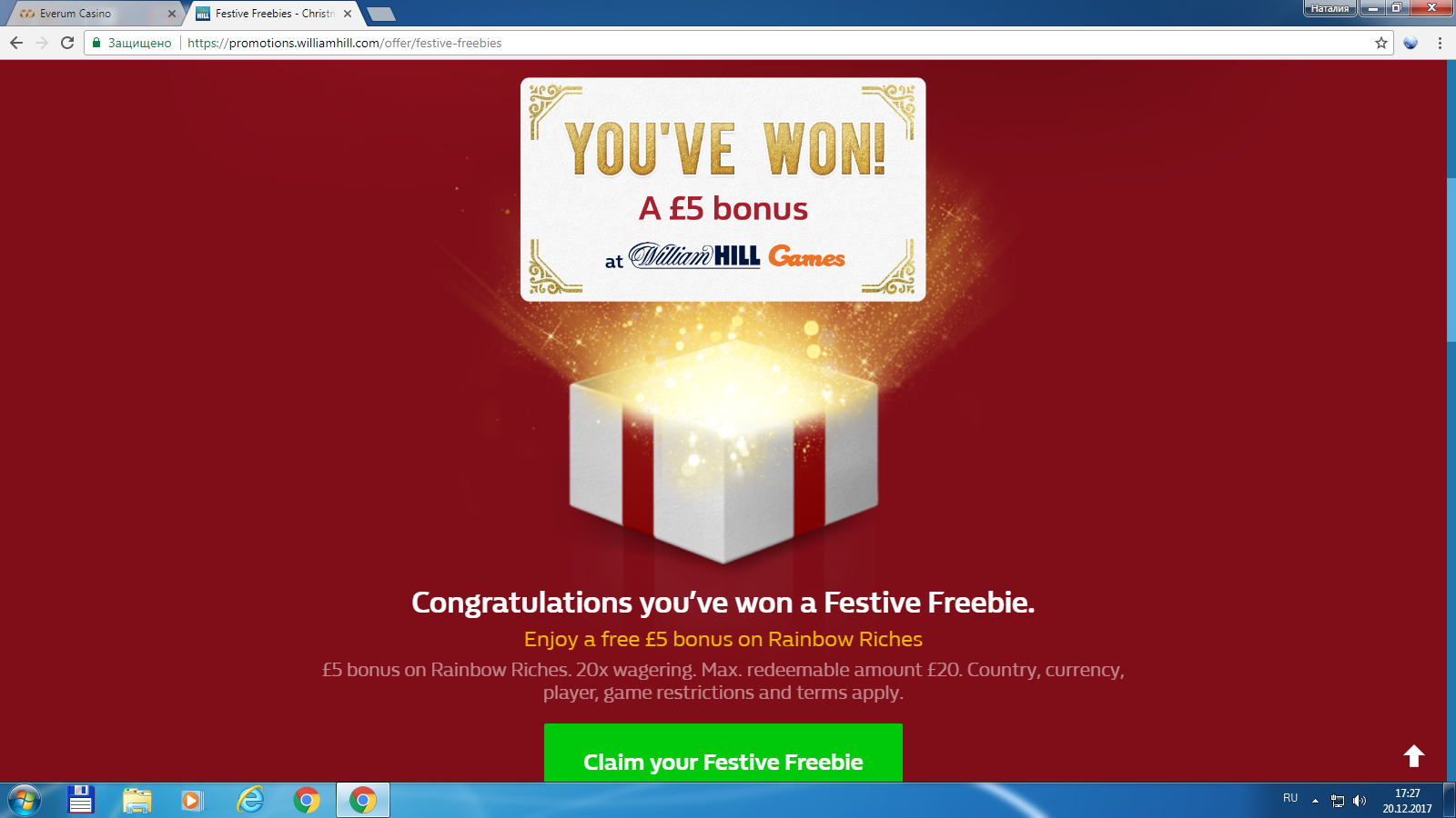 William Hill 27 декабря разыграет 250000 фриспинов для игры в Jingle Bells (раздел Vegas). За каждые £10, поставленнные в слотах Vegas с 21 по 26 декабря, вы получите один билет на 250000 Free Spins Giveaway (в условиях написано, что £1=€1/$1).