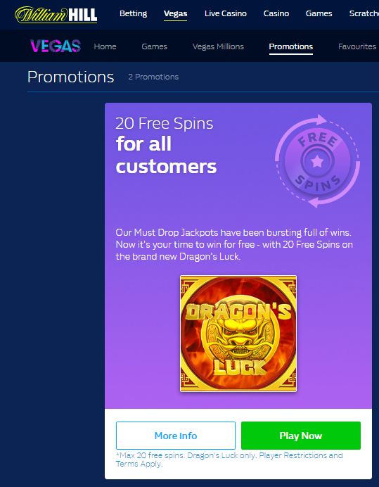 Регистрируемся в William Hill, переходим в вкладку Vegas > Promotions и берем 20 фриспинов в слоте Dragon’s Luck!