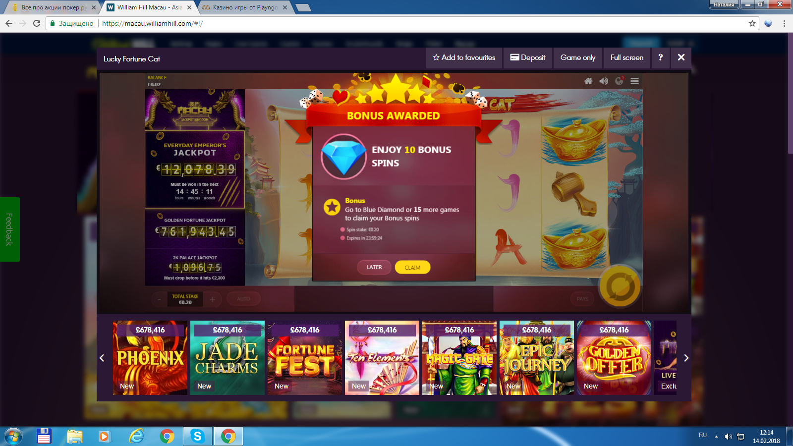 Бонус тоже отбил, 20-ка евро на выводе.. Слушай, пока эту пятёру отбивал, в процессе этого 5 фриспинов каких-то набил, не в курсе в каком слоте..?Первый день акции - https://macau.williamhill.com/#!/promotions/overlay/5-bonus-on-jk-slots-132?expand=off - дают 5$ с вагером 30