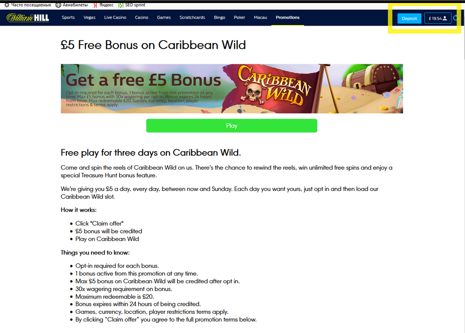 Бонус на депозит William Hill Живое казино бонусы до 300$