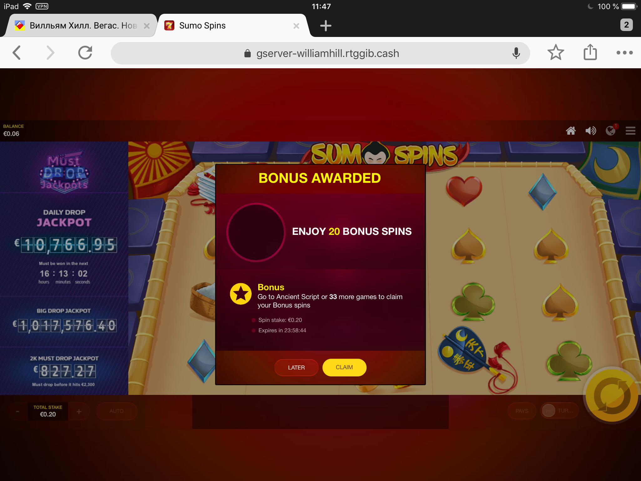 Вот когда они выпали на колесе, появилась эта табличка, я нажал Get Freespins и написало что то типа того что в данный момент не получилось почемуто применить эти ФС... И всё, табличка пропала.. в вегасе в промоакциях ничего вообще нет сейчас (