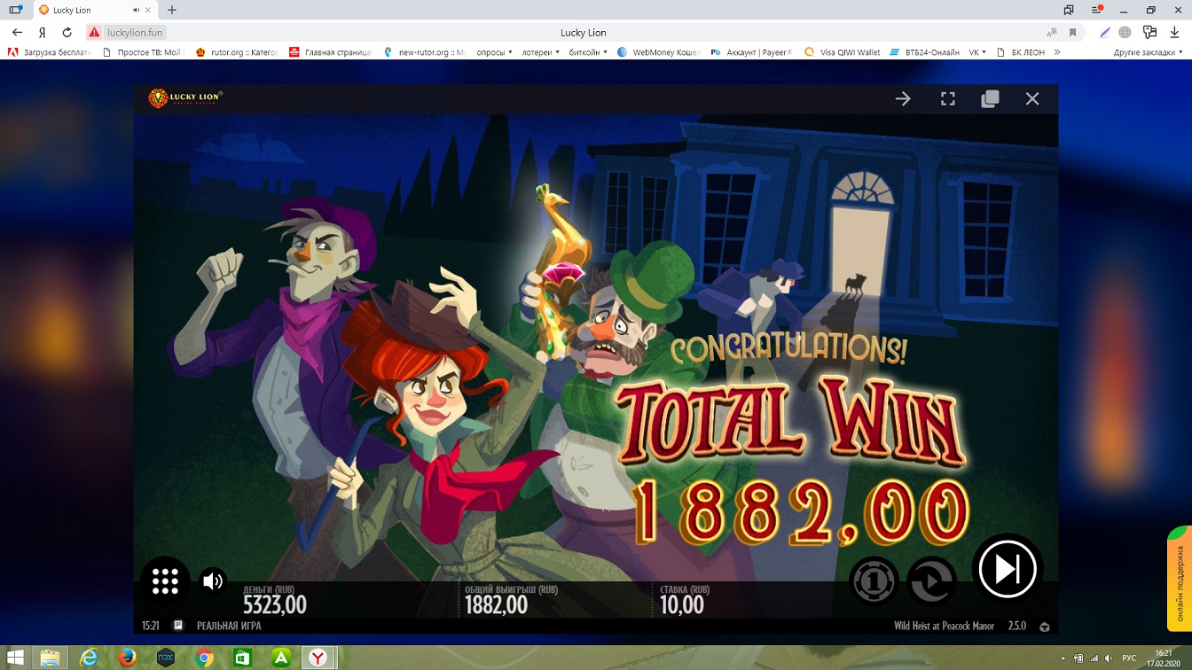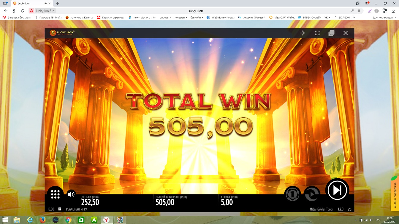 LuckyLion casino с депом в 500р(с конкурса) не разгуляешься,но сессия успешная оказалась начал с Мидаса х101 здесь в бонусе на последнем спине насыпало х575 ну и закрепил успех х188 х10 от депа на вывод это нормально