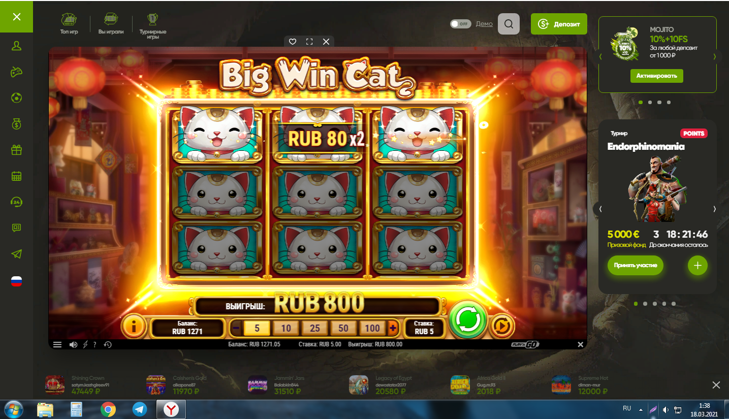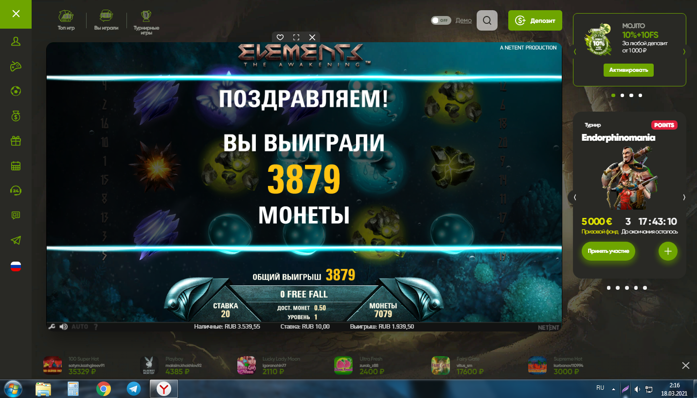 Эндорфина ювелир - играл в слот где-то с 15:00 до текущего момента, заходил с балансом 16к. Крутил от 2.5р до 5. Ни ниже, ни выше. Побил рекорд просадки баланса в эндорфине, хотя уже 3 дня ее играю нон-стоп, и ни разу выше х800-х1300 не проседал от ставки. А тут аж на х2800(если считать от 2.5р) или х1400 если от 5, просто по 2.5 больше накручено. Короче, самый жесткий слот эндорфины может и не побежден(плюсов на 160р за целый день игры), но отмазать 7к по 2.5-5 это жестко)